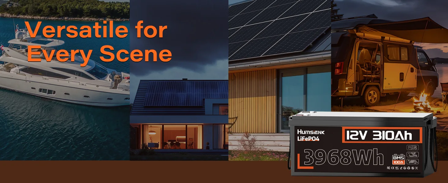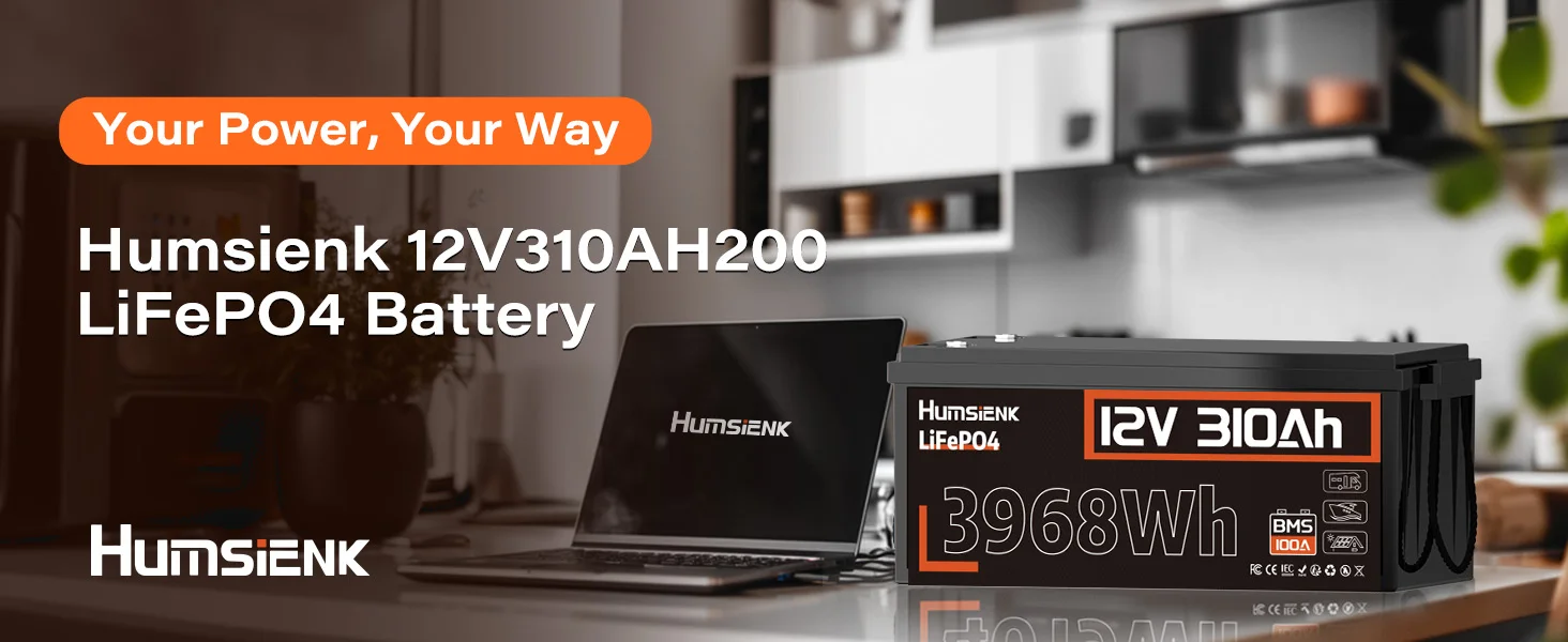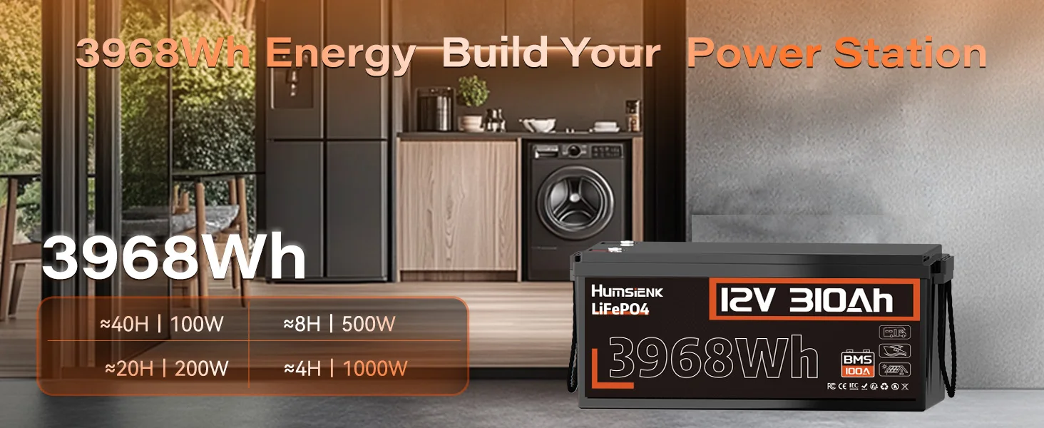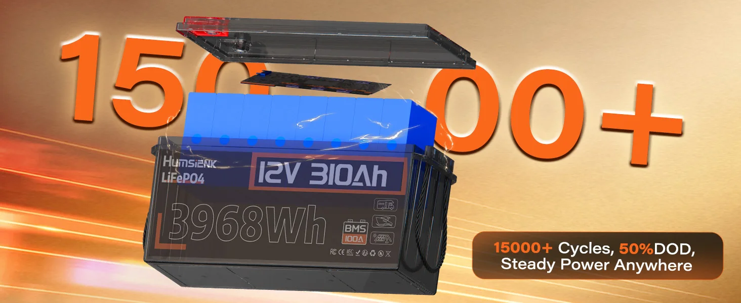 12.8V 310Ah LiFePO4 battery lasts up to 10 years and achieves 15,000+ deep cycles, 30 times longer than conventional lead-acid batteries. HumsiENK LiFePO4 battery 310Ah can provide 3.968kWh of energy when fully charged, with 100% depth of discharge(DOD).