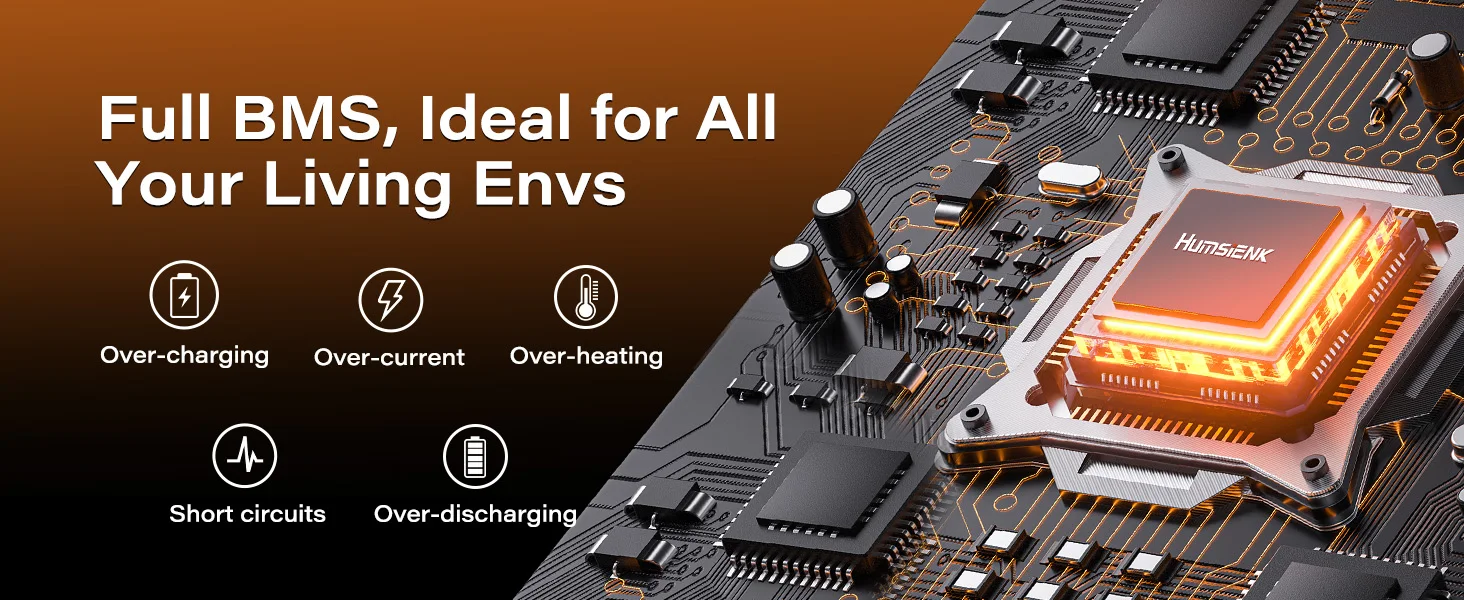 Features low temperature protection, HumsiENK lithium battery 12V automatically cut off charging below to -4℉ and above 158℉, work within -4℉ to 158℉, the wide range of temperature to enhance battery efficiency and longevity. Waterproof to IP65, making it ideal for outdoor use as an RV battery.