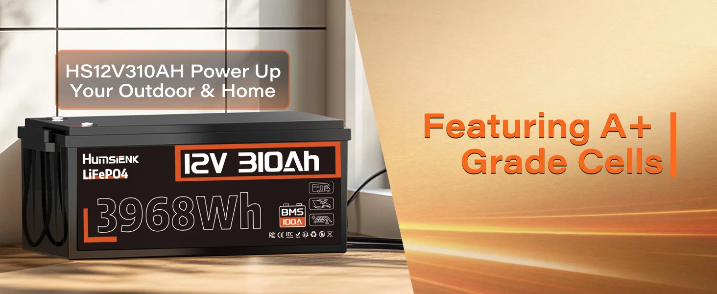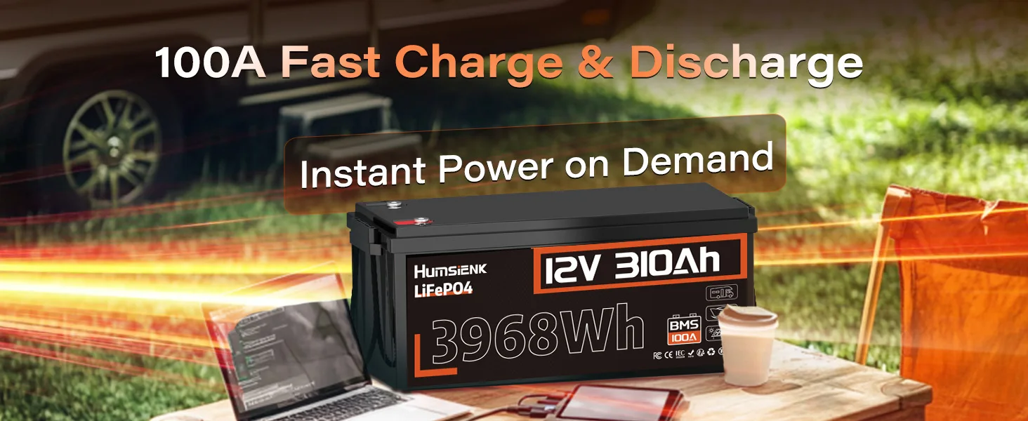 With premium charging technology, HumsiENK 12V 310Ah LiFePO4 battery fully charge only with 1.55 hour. High efficiency output of 3968Wh and a Max. Current of 100A, allow it provide consitent power for your devices.
