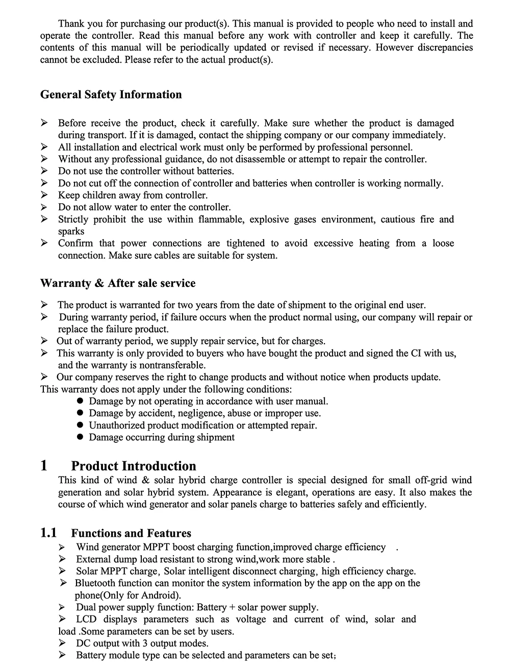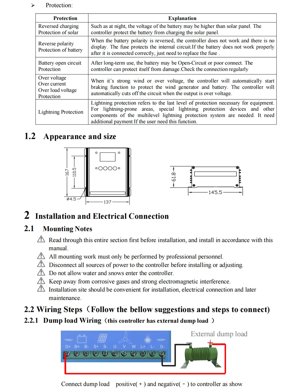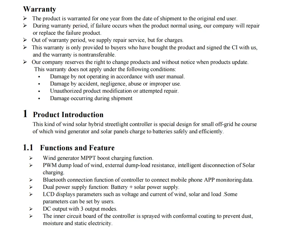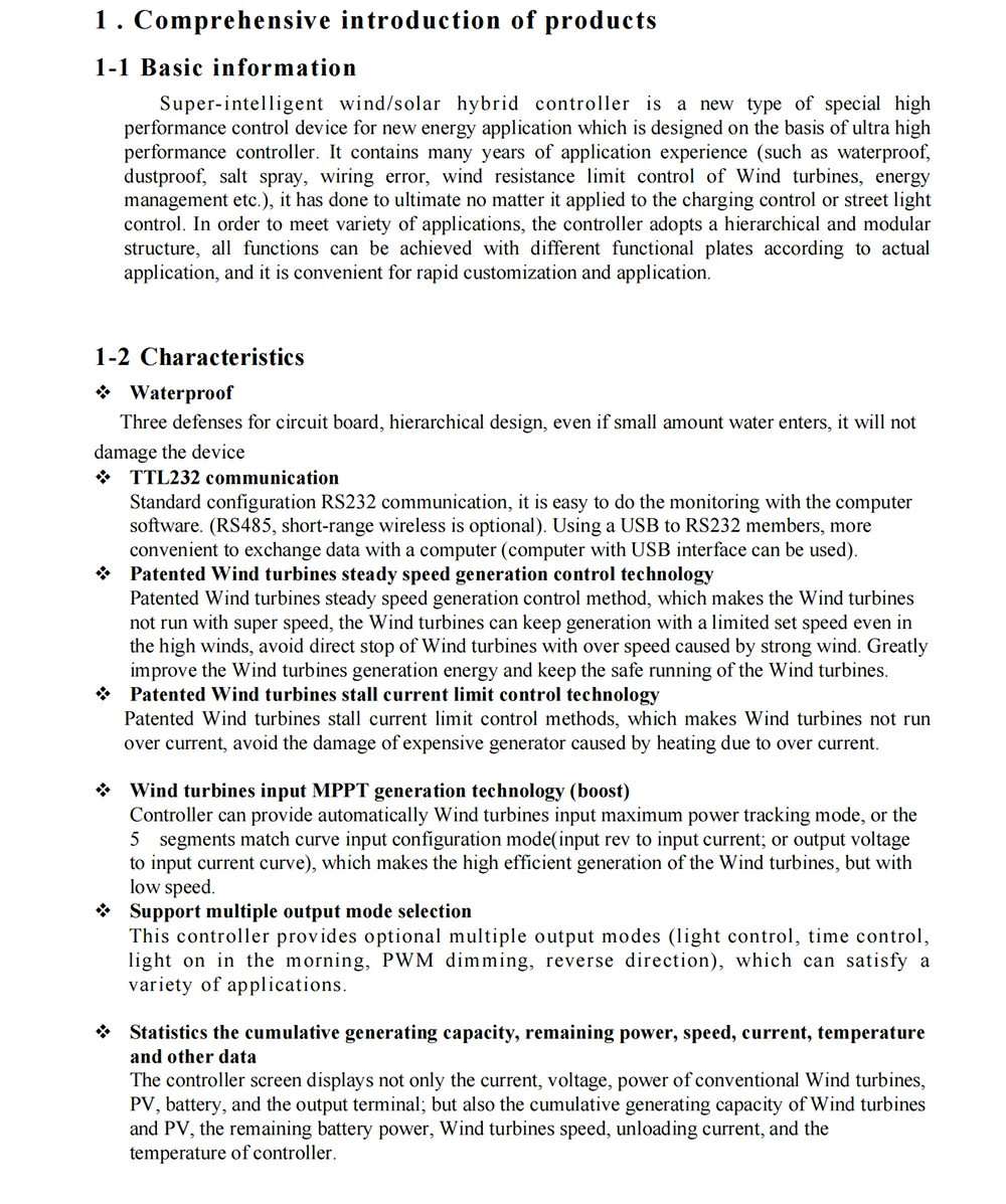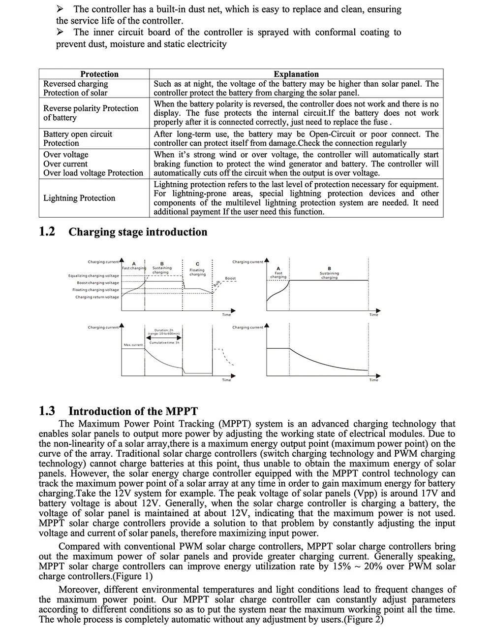 Protection Type:Solar Reversed Charging protection, Battery open circuit protection, Battery anti-reverse connection protection protection, Over current and over voltage auto, Brake protection, Over load protection,etc.