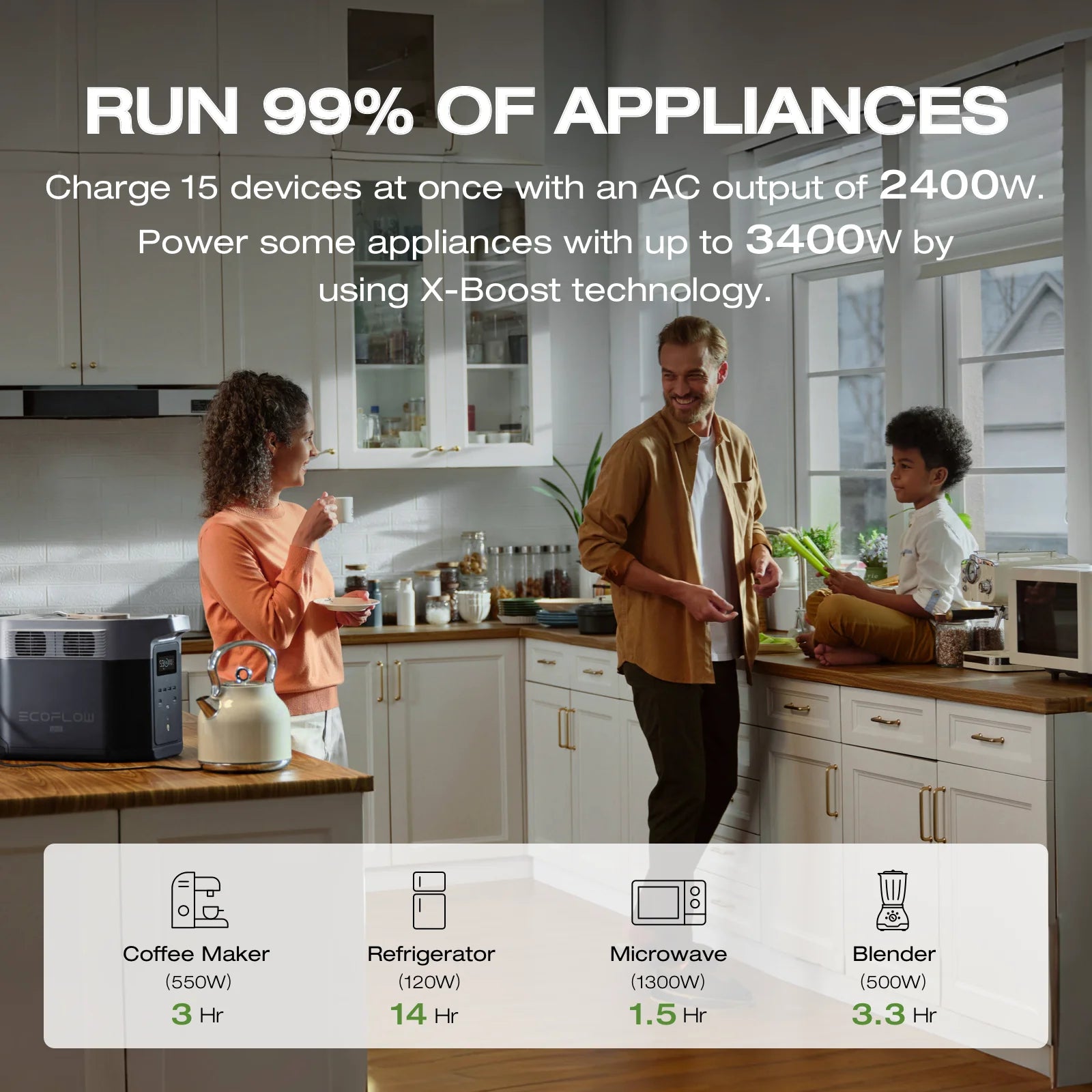 Power 99% of Your Household Devices. Run pretty much any of your home appliances with up to 2400W. With 15 outlets, there's space for any device, and using X-Boost mode, power high-wattage appliances with up to 3400W.