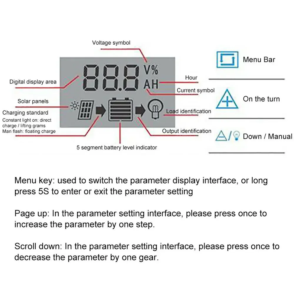 - Large screen LCD display, charge and discharge current display, cumulative power generation and discharge power query, temperature display, light control + delay control; adjustable charge and discharge parameters, with power-off memory and other functions.