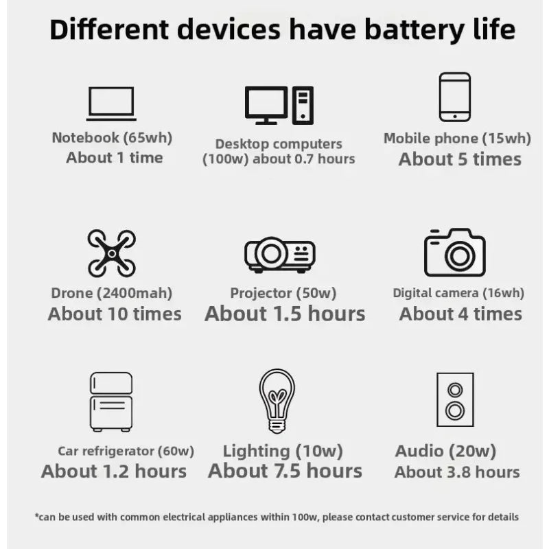 3. Compact and Powerful: Improved over other products on the market, the outdoor camping power bank boasts a smaller volume and lighter weight while maintaining powerful functionality. It can power a variety of electronic devices, making it a convenient and reliable choice for outdoor use.