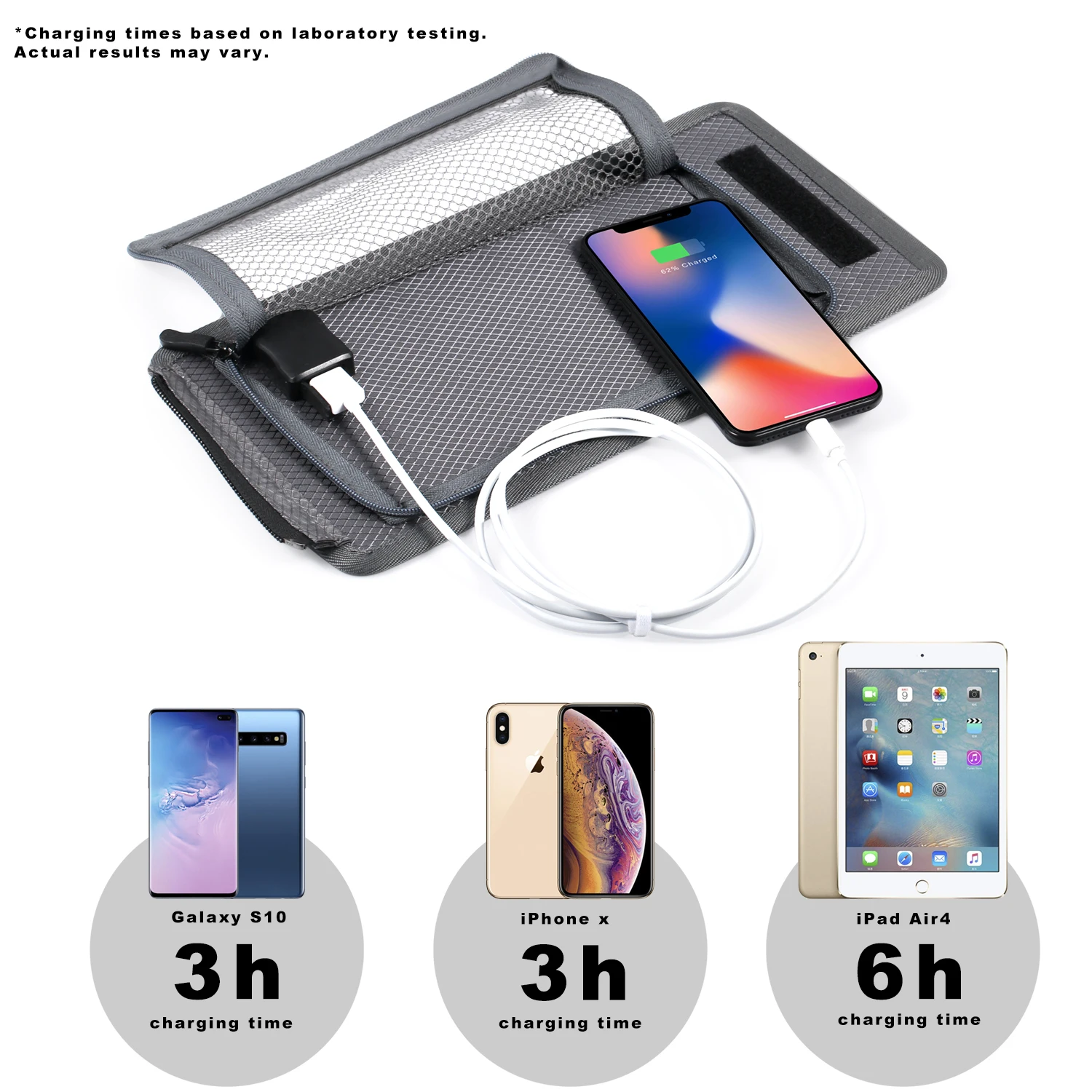 PORTABLE SOLAR CHARGER ---- Solar chargers for electronic devices compatible with any USB powered 5V input voltage devices, such as an iPhone PLUS, X, 8, 7, 6, 5S iPad, Galaxy S8, S7, S6, S5, ibose, tablet, Edge, Note, mini, Nexus, LG, HTC, action camera, Android mobile, go-pro, GPS, Kindle, speakers, power banks of various capacity etc. And the solar panel removable via zipper so that it easy attachment to backpacks.