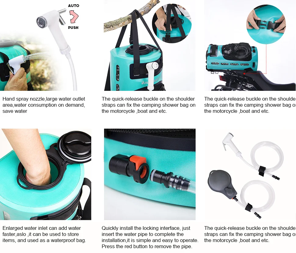 【High Efficient Foot Pump】Step on the foot pump to pressurize the high-capacity shower bag,So that you can take a bath quickly when you are leave home. Due to the updated check valve, water will not flow back to the pump.